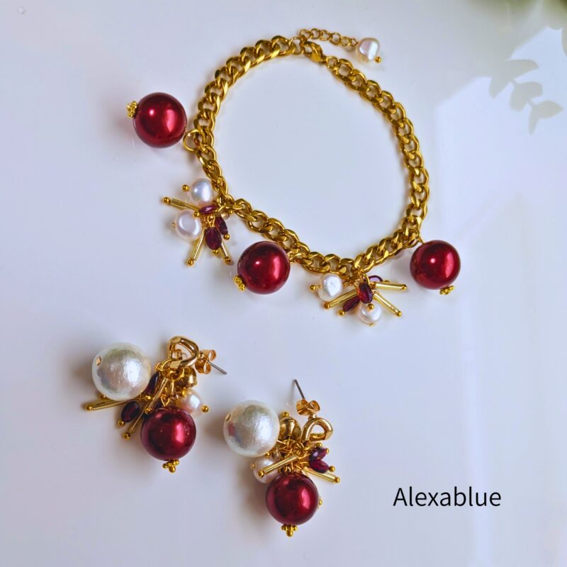 ガーネット × 淡水パール クリスマスジュエリーセット|レッドパールのブレスレット&大ぶりピアス〈大人華やかパーティアクセ〉