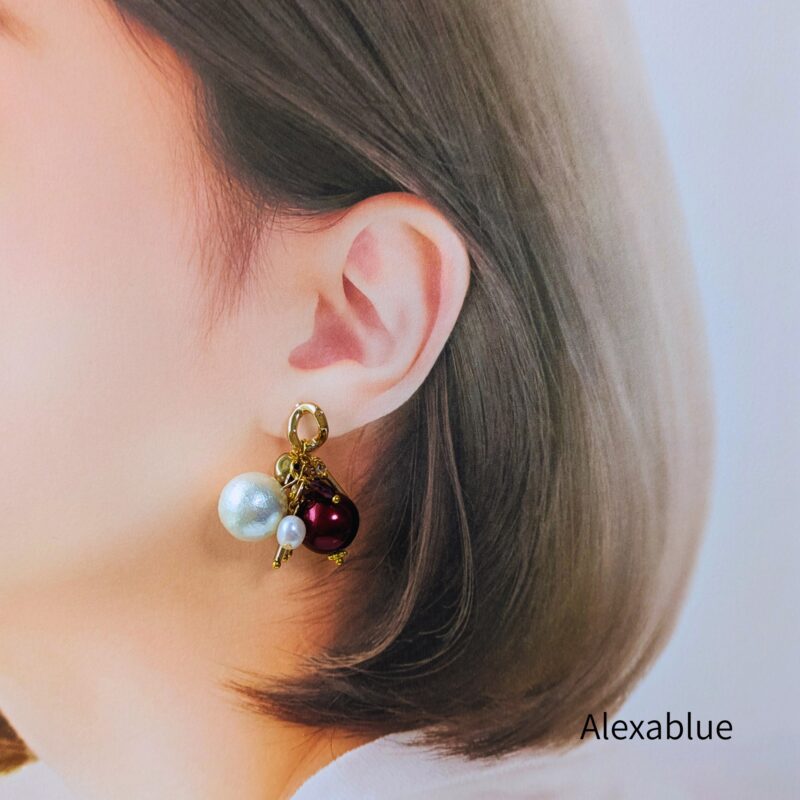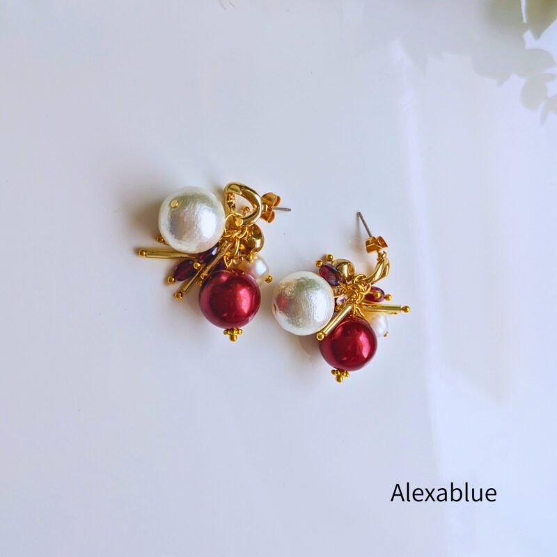ピアスにはガーネット・コットンパール・淡水パールをバランスよく配置。