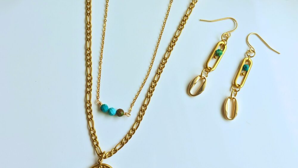 ターコイズの爽やかなブルーが胸元と耳元を彩る、ステンレス製のネックレス&ピアスセット。 重ね付け風デザインのネックレスと、縦に揺れるチェーンピアスがセットになっており、大人カジュアルな装いに華やかさをプラスします。 錆び … 続きを読む ターコイズ ステンレス ネックレス&ピアスセット レディース 天然石 ジュエリー 大人カジュアル シンプル おしゃれ 金属アレルギー対応
