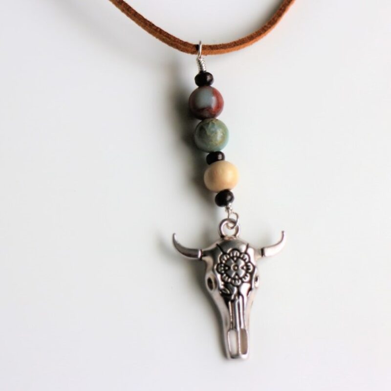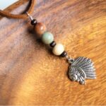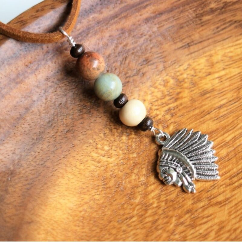 ネイティブ風チャームとインプレッションストーン(天然石)、ウッドビーズの組み合わせがかっこいいおしゃれなCarルームミラーハンギングです。