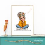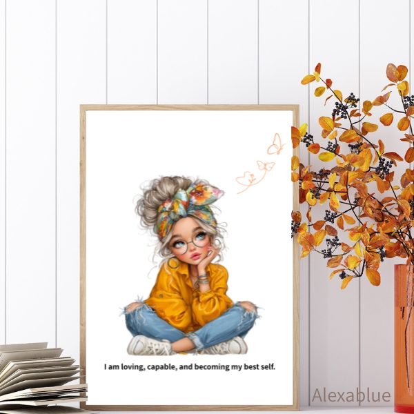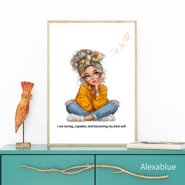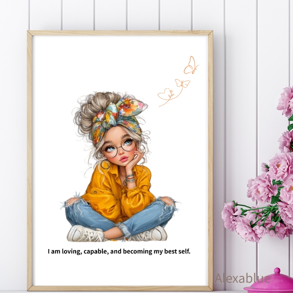 “I am loving, capable, and becoming my best self.” の言葉と、優しく強い雰囲気の女の子のイラストを組み合わせた、女の子の部屋にぴったりのインテリアアートです。